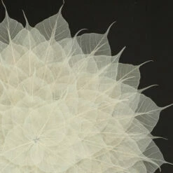 - A textured metallic silver frame houses layers of translucent white leaves forming a radial floral mandala pattern; leaves are invisibly adhered to black fabric backing
