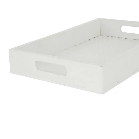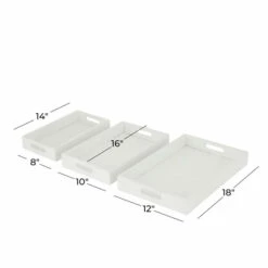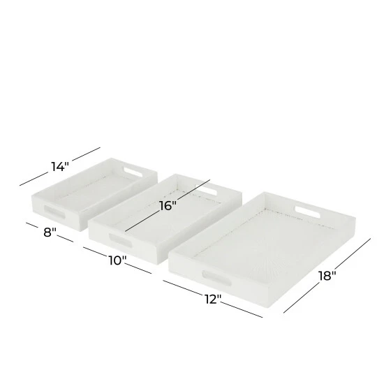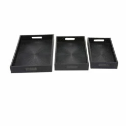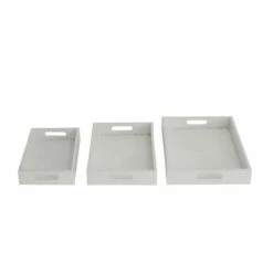 Arrange your belongings with one of these wooden tray organizer and set them on your coffee or counter tables for a touch of vanilla. A storage piece that is spacious for your trinkets or decorative goods on your mantle, coffee table or kitchen counter. Keep your table top protected as you display your memorabilia and belonging on these trays. This item comes shipped in one carton. Suitable for indoor use only. Made in India. Set of 3 wooden trays. Contemporary design.