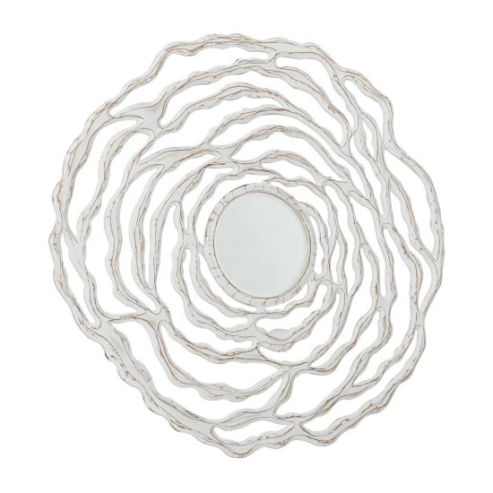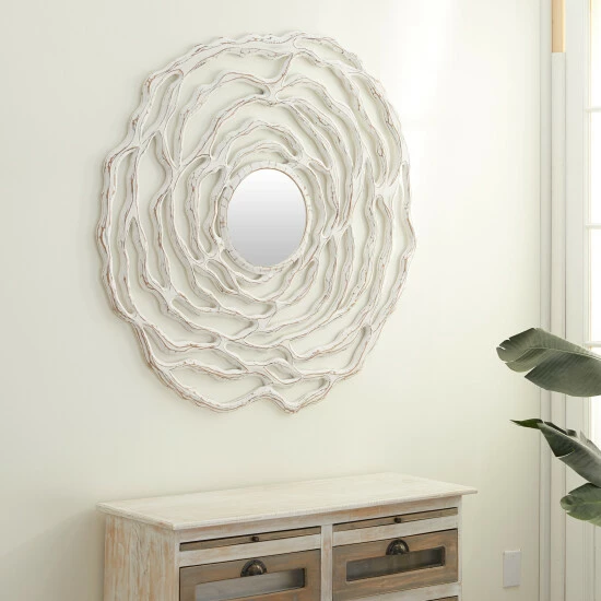 This large wood accent mirror adds soft movement to your walls, brining out your boho, coastal, or natural space’s style. Layers of carved-through wavy lines form an abstract floral sculpture with a small round mirror in the center. These petals have a distressed white finish, adding a bright pop as well as texture and depth. From your foyer to bedroom, this beautiful mirror is easy and ready to hang in any room of the house needing an artistic, soft touch. Ready to hang by t-hook hardware in back. Suitable for indoor use only. This item comes shipped in one carton. Made in India.
