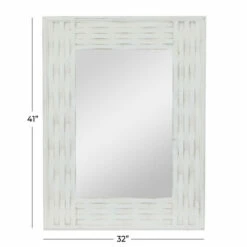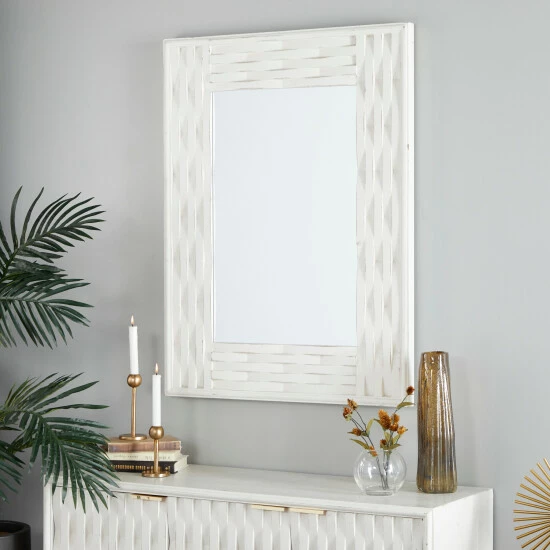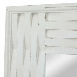 Display a charming and pragmatic decor to your walls with this wall mirror and at the same time add an illusion of space inside your home. Wall mirrors offer a reflective property that helps naturally brighten up any room in your home. It makes a great centerpiece over your sofa or console table, or in your dining room or bedroom. This item comes shipped in one carton. Glass mirror is attached to carved wooden frame. Easy to hang with 4 D-ring hooks attached to backing hardware. Suitable for indoor use only. Contemporary design.. These pieces are designed to offer any contemporary themed home a final touch.. This home decor is crafted with wood and glass mirror for a solid and durable form. This wall mirror highlights a distressed daisy white finish that gives emphasis to the detailed pattern on its frame. Dutch weave patterns are carved into the frame of this wall mirror for a charming and elegant touch. This item measures 32″L x 2″W x 41″H and weighs 29 lbs