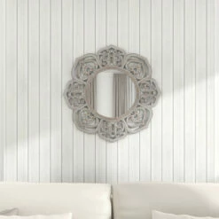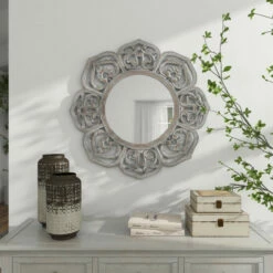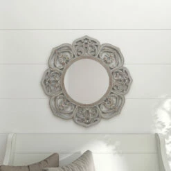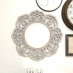 - This delightfully elegant white wooden mirror for wall features an 8-petal flower design made of carved wood and showcases intricate scrollwork patterns