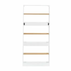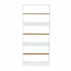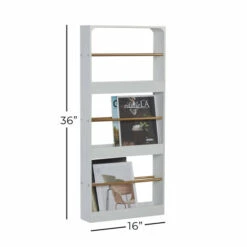 This wall-mounted magazine holder features a white wooden body (MDF) and gold iron rails, making it a suitable addition to modern-themed interiors. It has three levels of racks that can fit light reading magazines, photo books, small coffee table books, and file folders. Hang it in the office or at home via the two attached metal backings on the top back corners. This item comes shipped in one carton. Magazine holder is wall-mounted. It hangs via two metal backings at the top back corners. Suitable for indoor use only. Holds up to 20 lbs. Glam inspired.