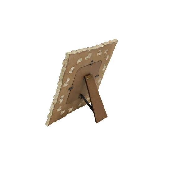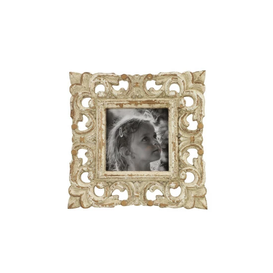 This square picture frame has hand-carved detail, adding an ornate touch with vintage European country style. The frame is made of MDF and has a distressed white finish creating a versatile hue that will complement any color palette. Display on a tabletop or shelf with easy-open easel back. Ships in 1 carton. Easel stand backing with secure hardware for stability. Suitable for indoor use only. Photo frame can hold 1 picture with 5″x 5″ frame opening. This set includes 2 photo frame. Vintage inspired. Due to the handmade nature of this item, no two will be alike, there will be slight differences in shape, size, and color.