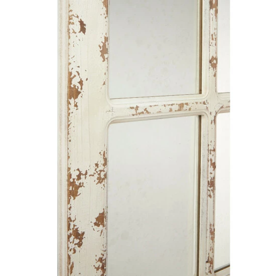 Β Bring bold vintage style and reflective light to your space with this large, 3-paneled, vintage white floor mirror. The arched silhouette, distressed antique white finish, and interior window frame around the mirrors add a textural vintage cottage look to your wall. The mirrors will reflect light, making your room or hallway feel bigger and brighter. The neutral white hue of the distressed wood frames with decorative carvings works with any color palette or wallpaper. Hooks on the back lets it hang with ease. Suitable for indoor use only. Each set comes with 3 white arched wall mirrors. This item comes shipped in one carton.