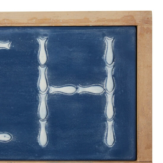 - Intricate fish-shaped carvings form each letter of this wall sign decor