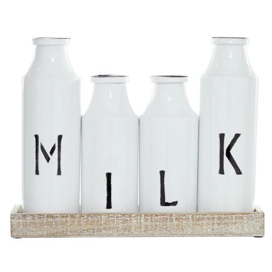 - Features four white metal bottles in different sizes that form the word “MILK”, and a natural brown wooden tray