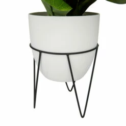 - A porcelain white planter highlights the lush green shade of this artificial indoor plant for a natural look