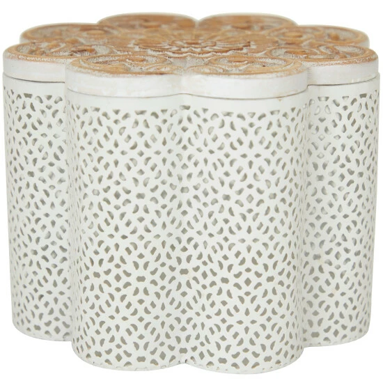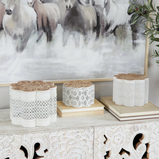 - Chiffon white finish highlights each floral shaped metal box with whitewashed wood brown lids