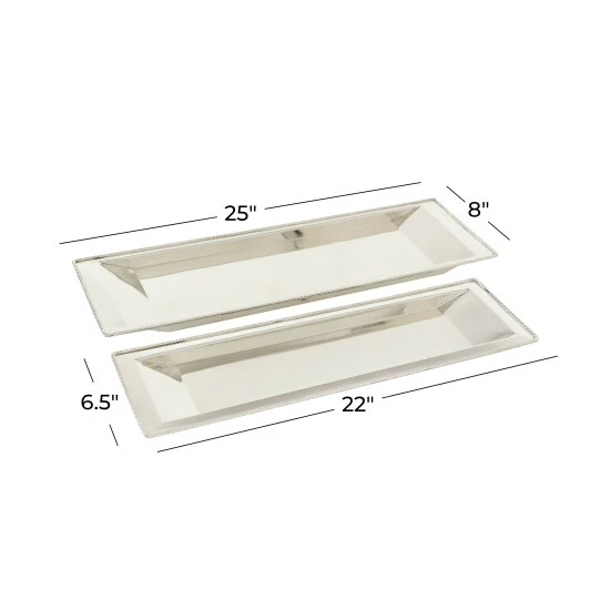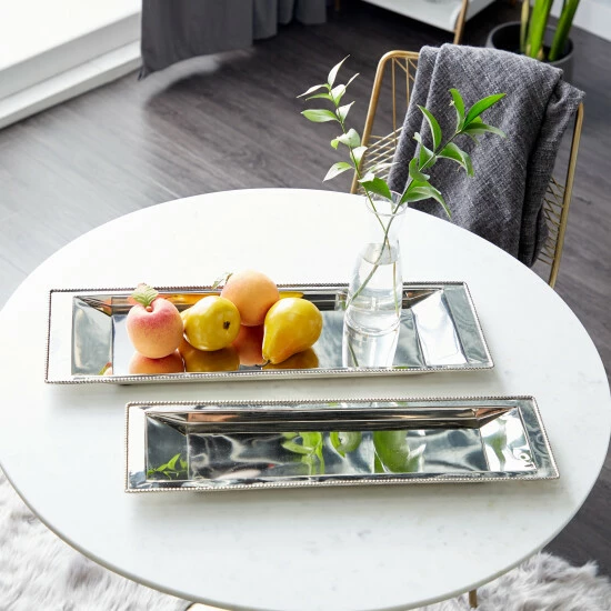 Get organizing and decorating an elegant vibe with these traditional-themed trays as centerpiece or accent organizers on your tables. Whether in your kitchen, or on your coffee table, it’s a great way to display and store your favorite things. A storage piece that is spacious for your trinkets or decorative goods on your mantle, coffee table or kitchen counter. Designed with black rubber stoppers at the base that prevent scratching furniture and table tops, as well as sliding around. This item comes shipped in one carton. Please note that this item is for decorative purpose use only and are not food safe. Suitable for indoor use only. Made in India. Each set comes with 2 decorative trays. Traditional theme.
