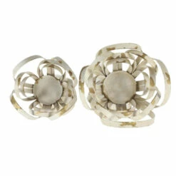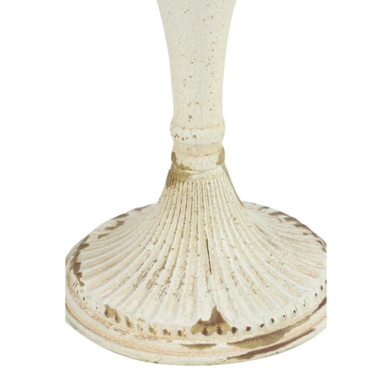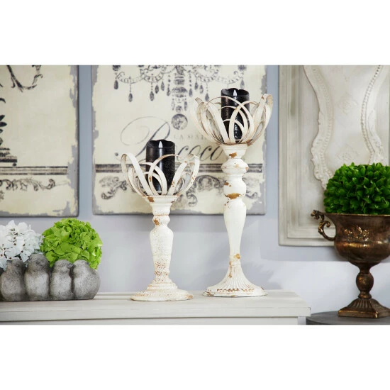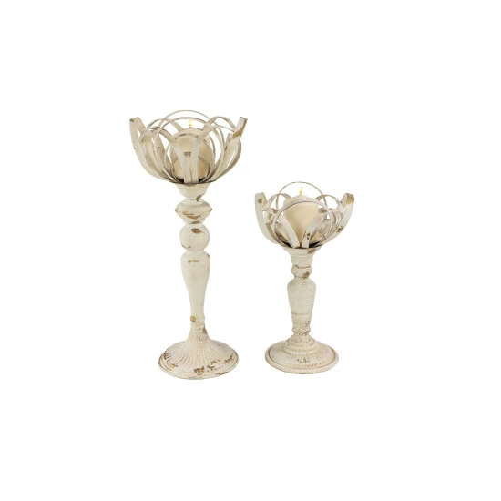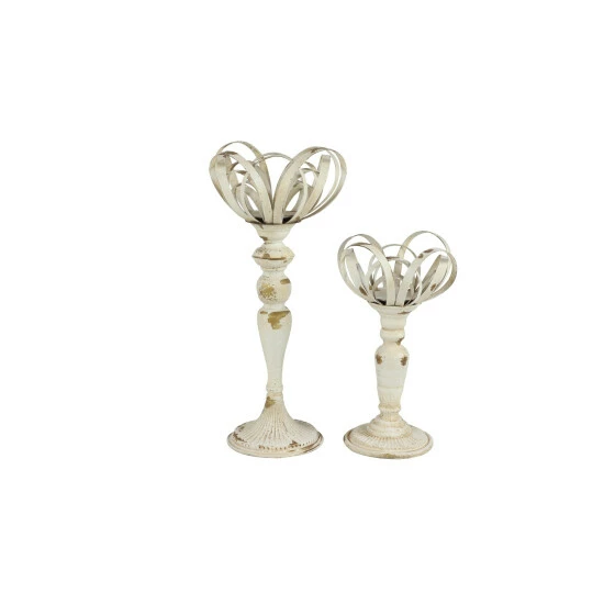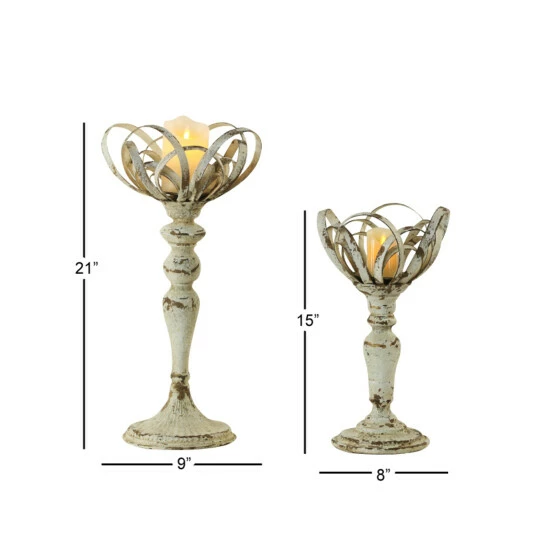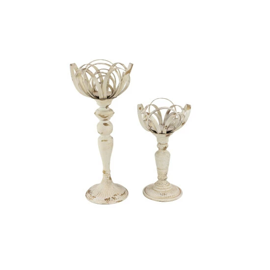 Elegant lighting that also serves as vintage tabletop and shelf decor, this set of 2 tall metal candle holders with goblet shapes bring antique flair and dreamy illumination your space. Ornately-looped strips of metal form layers of ribbon-like texture around the upper candle plates. Beneath, the turned metal column candlesticks flay into round bases with intricate decorative carvings. Full of texture, the antique white finish on both candle holders has heavy distressing, revealing the dark iron beneath for an authentic vestige look.