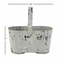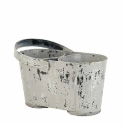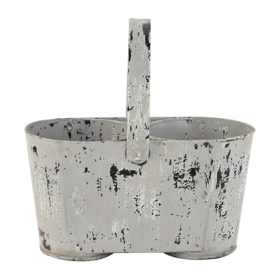 The distressed white finish with decorative chipping and rust accents of this large planter brings an authentic Farmhouse and antique feel to your garden area, patio, or indoor space. The neutral white hue with black markings adds texture while complementing any color palette or pattern. Easily transport indoors and out by the sturdy metal handle. The double planter construction lets you display 2 of your favorite plants side by side for a full foliage look with a Farmhouse feel. This item comes shipped in one carton. Suitable for indoor and outdoor use. Made in India. Vintage inspired.