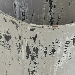 - Two round planters covered by a metal strip to form one long planter with a large metal handle; distressed white paint finish with decorative rust has a worn antique look