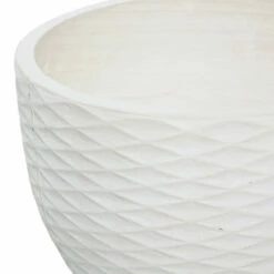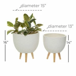 Indoors or outside, this ceramic planter duo make stylish touches to your decor (and plants) with their fun patterns. Each large round planter has a deep bucket shape and a textural and dimensional diamond design around the outside. Nodding to mid-century style, each white planter’s tripod base is crafted from natural light brown rubber wood. The tapered legs jut out for sturdy display and a modern silhouette. No drainage, so no spills. A perfect complement to mid-century modern and contemporary styled spaces Wipe clean with a dry cloth. Suitable for indoor and outdoor use. Made in China These indoor planters comes as a set of 2. Contemporary design. This item comes shipped in one carton.