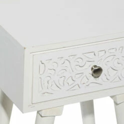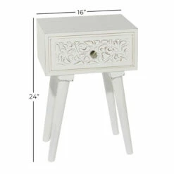 - This decorative rustic white or grey accent table feature a tall rectangular shape and a romantic wooden-carved drawer design