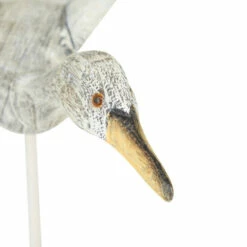 - These wooden bird sculptures feature a textured and whitewashed body with blue finished wings, orange eyes, and yellow-gray beaks