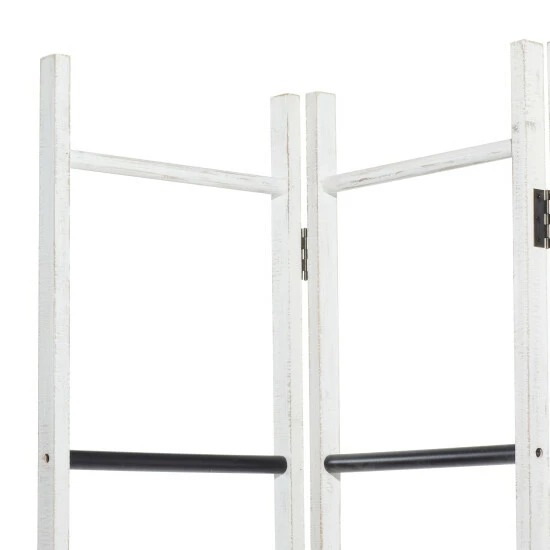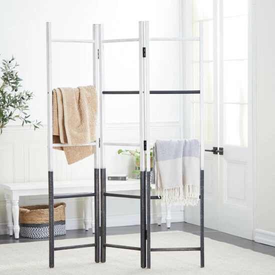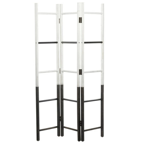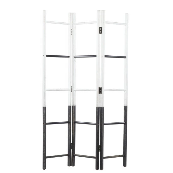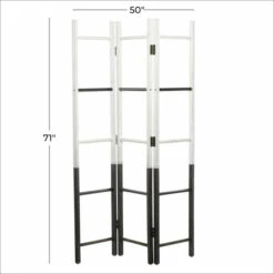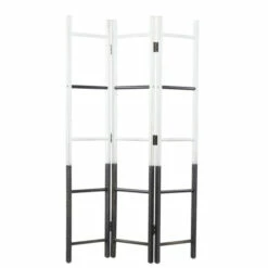 Providing function in a stylish way, these room dividers work double duty as privacy screens and standing art. Stand against a wall as a large accent piece, or in the middle of a room to add some privacy and divided space, this room divider is too style to hide away. This mobile screen divider will add much needed style your minimalist living room, bedroom, or kitchen in a low-profile design. Designed like hanging rack ladders. Farmhouse themed. This room divider features 3 panels. This item ship in one carton.. Features a modern style inspired design for a minimalist appeal. This beautiful accent piece is made from sturdy metal and wood materials. This unique screen divider sports a dual tone finish where the upper part is in white while the rest is in a black shade. This minimalist screen divider resembles 3 hanging rack ladders joined together to form a mobile screen divider which you can place anywhere to add some accents in your minimalist home. Item measures 50″L x 1″W x 71″H and collectively weighs 12 lbs