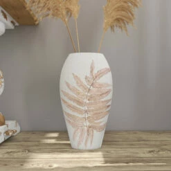 This large white floor vase boasts a natural style from top to bottom, with its gritty matte white finish that looks like a stone to the large, natural beige-colored arched leaf overlay that creates a 3D fossilized look. The tall body and flat, wide opening support large vase filler like faux grass and twigs, which complement the earthy, natural style of this leaf vase beautifully! Suitable for indoor use only. The vase does not have drainage holes. White tulip-shaped polystone vase with oblong 5. 30″ mouth opening. Bohemian theme. This item comes shipped in one carton.