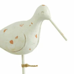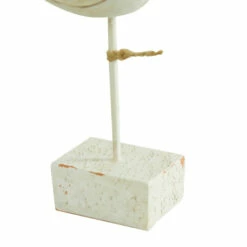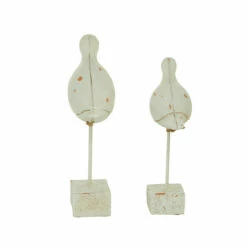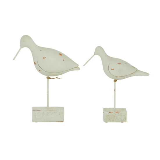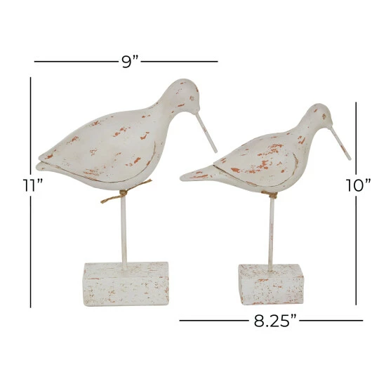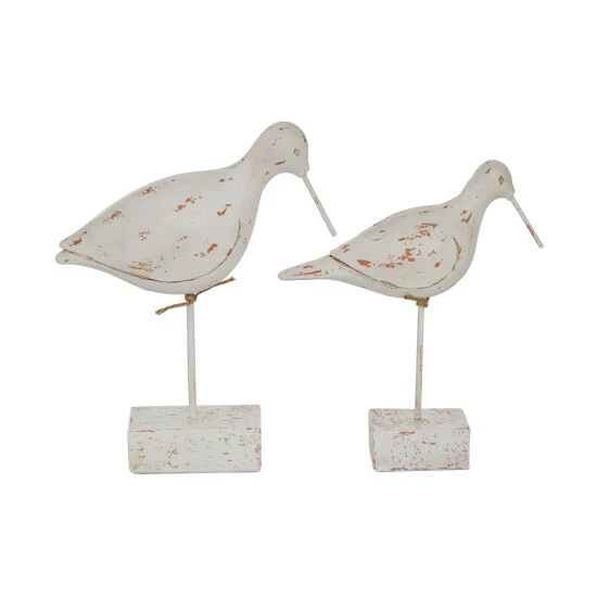 Complete your coastal style space with this pair of bird decor sculptures. Finished in distressed white, these large and smaller bird statues are crafted from resin with powered stone overlays. Each white bird depicts an egret or ocean bird, and each is poised on a solid resin block with stoppers to prevent scuffing, also finished in distressed white. Each white bird is accented with a loop of natural jute rope for an extra nautical accent. Their minimal style suits modern coastal spaces. Designed with black rubber stoppers at the base that prevent scratching furniture and table tops, as well as sliding around. This item is shipped in one carton. Suitable for indoor use only. This set includes 2 decorative sculpture. Coastal design.