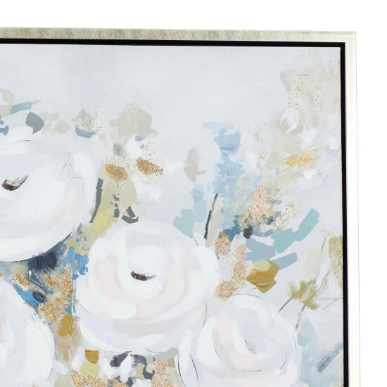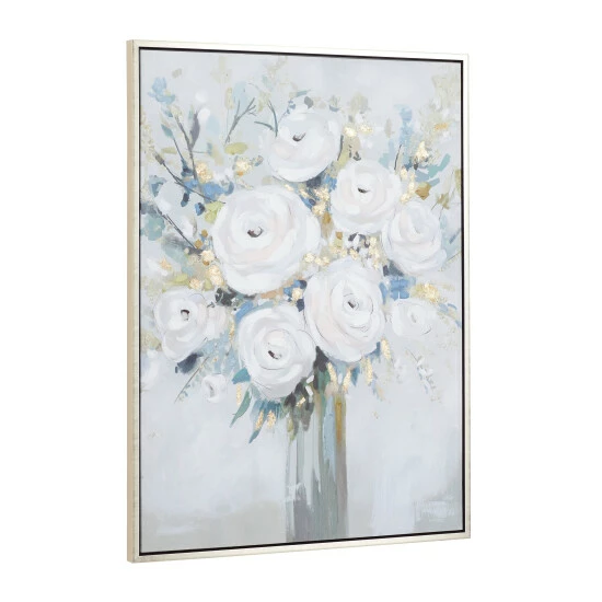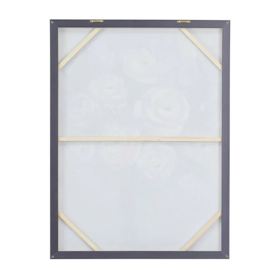 Display this enchanting flower wall art as a focal point canvas for your delightful living spaces that features light toned walls and pastel toned decor pieces. Bring a finishing touch to your home with an inviting appeal with this console table. Useful and elegant, console tables are more than just a place to throw your mail. This item is shipped in one carton. Due to the handmade nature of this item, no two will be alike, there will be slight differences in shape, size, and color. This item comes with sawtooth hardware at the back for easy hanging via nail or screw. Suitable for indoor use. French Country style.. A French country strikes a balance between rustic & elegant. This metallic silver framed canvas wall art features a gray flower vase with white roses and decorative stems in various earth tones. This rose canvas wall art is crafted from polystone, iron, Chinese fir wood, and canvas fabric. This wooden framed flower wall art features a tall flower vase painting filled with large roses and stemmed leaves in various shapes, textures, and heights. This framed canvas art measures 36″W x 48″H