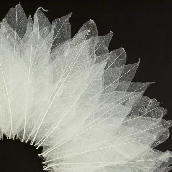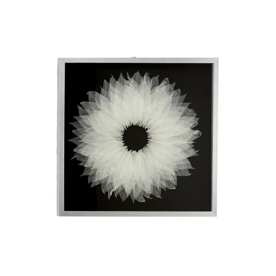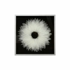 Statement wall art with botanical and natural style… Layers of long, translucent white leaves that look like delicate feathers are meticulously placed in a radial pattern forming a textural and gradient floral design. A square, textured silver frame houses this dimensional natural wall decor whose leaves really pop against the solid black background in the shadow box. The neutral silver, black, and white hues of this wall accent piece will work with any color palette in your space.