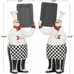 Get inspired with the creation of your daily menus as you place these chefs with chalkboards figurines on top of your kitchen islands, bars, and dining areas. Create a balance surface space and added dimensions with this playful chef sculptures. Keep notes and your favorite recipes the old fashion way with the addition of the black chalkboard. This item is shipped in one carton. Suitable for indoor use. These pair of chef sculptures come as a set of 2. Traditional style.