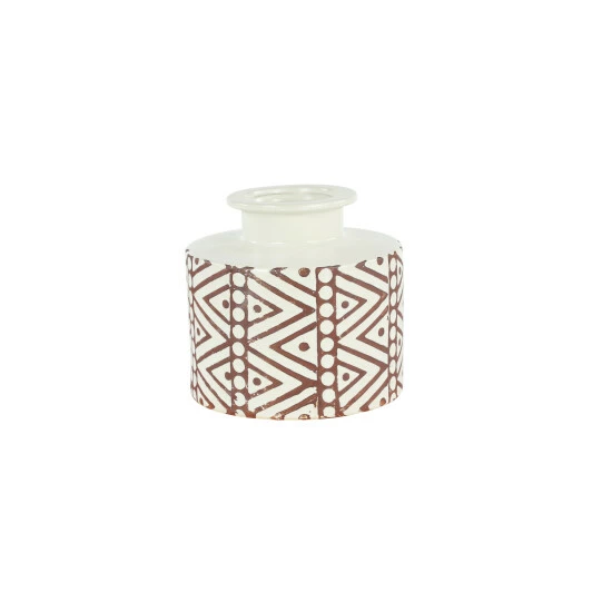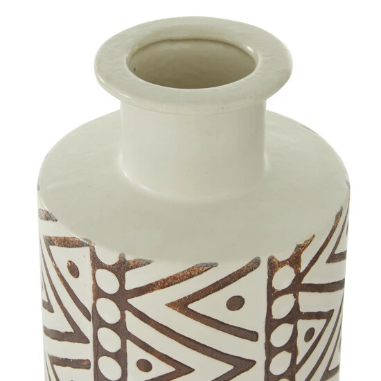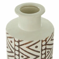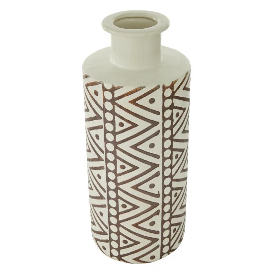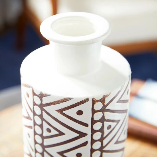 If you’re searching for some cool home decor, you’ve found it in this boho style vase… This tall vase has a cylindrical shape with lots of personality, from its bold silhouette to the grainy, chestnut-colored zigzag tribal pattern juxtaposed against the creamy white, smooth base glaze. The silhouette is lovely with its angled shoulders, tall neck, and flat 2″ rim, all solid creamy white, providing clean lines and a modern shape contrasted against the movement and color of the tribal pattern that is coarse to the touch. This item ships in one carton. Suitable for indoor use only. Tapered neck cylinder vase with narrow rim opening. Eclectic theme.