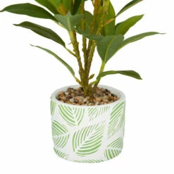 - A white planter with green accent details highlight the lush green shade of this artificial indoor plant for a natural look