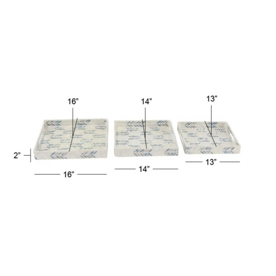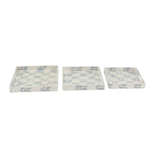 Use as a serving tray or as a décor holder on your coffee, console, and kitchen tables for a useful decorative piece. Whether in your kitchen, or on your coffee table, it’s a great way to display and store your favorite things. Bring the warmth of shell, wood, and coastal style into your home with this set of rectangular shell inlaid wooden trays. Place each piece on any accent table as a serving tray or even a decor tray that can hold your fancy decors and embellishments. Suitable for indoor use only. Each set comes with 3 rectangular wood and shell trays. Coastal theme. Please note that this item is for decorative purpose use only and are not food safe. This item ships in one carton