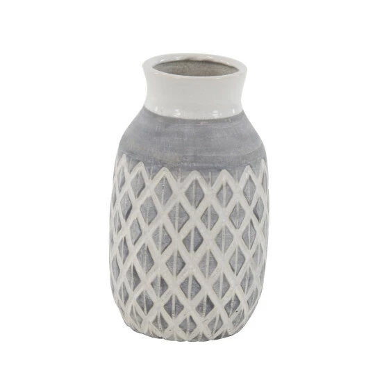 Gray-finished neck and white-finished, crisscross-patterned body highlight this 13-inch spouted vase made from solid stoneware. Showcasing a textured finish, this product offers a luxurious accent to any modern homes. Get this charming ceramic vase and display various types of fresh ornamental plants in your living room, dining room or bedroom. You can have it at a price that will surely suit your budget.