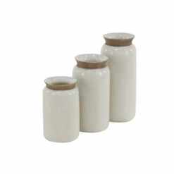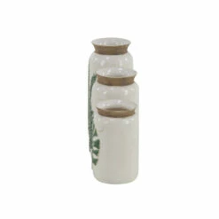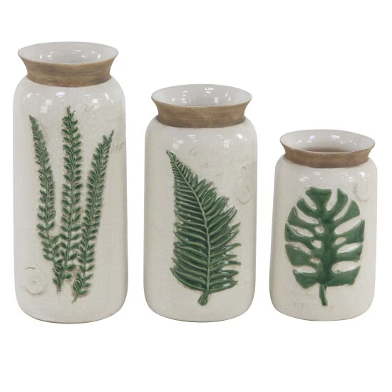 Subtle sophistication and cozy style define this set of country cottage style ceramic vases. The trio of vases has tall cylinder smooth white bodies with textured green leaf relief details. The set features a muted gold necks, which works very well with long-stemmed flowers or small bouquet arrangements. Place on a dining table or coffee table to create an intimate ambiance in modern and coastal themed homes. Designed with black rubber stoppers at the base that prevent scratching furniture and table tops, as well as sliding around. Suitable for indoor use only. Each of these stoneware vases feature a 3″D, 3. 50″D, and 3. 50″D mouth openings. Set of 3 ceramic vases in a smooth white finish. This item comes shipped in one carton.