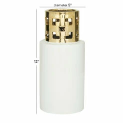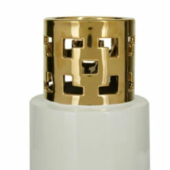 - Geometric cut-out patterns adorn the golden neck of this glossy white cylinder vase