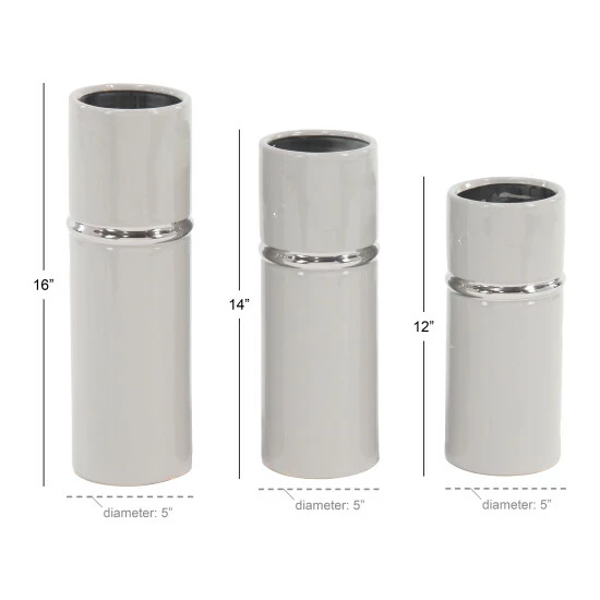 Step up your glam home design with this round white and silver stoneware decorative vase set. Made with stoneware, each vase highlights round belted carving accents with metallic silver details over a glossy ivory white base finish. Placed as standalone displays or as a set of 3 on your coffee or console table, these stoneware vases are fashionable statement pieces for your glam-themed home space. Suitable for indoor use only. The vase measures 4″ mouth openings. This set includes 3 vases. This item comes shipped in one carton.