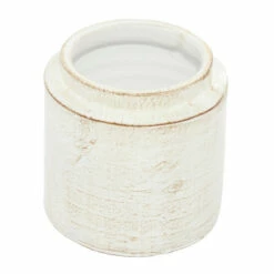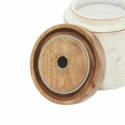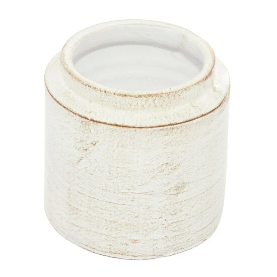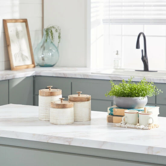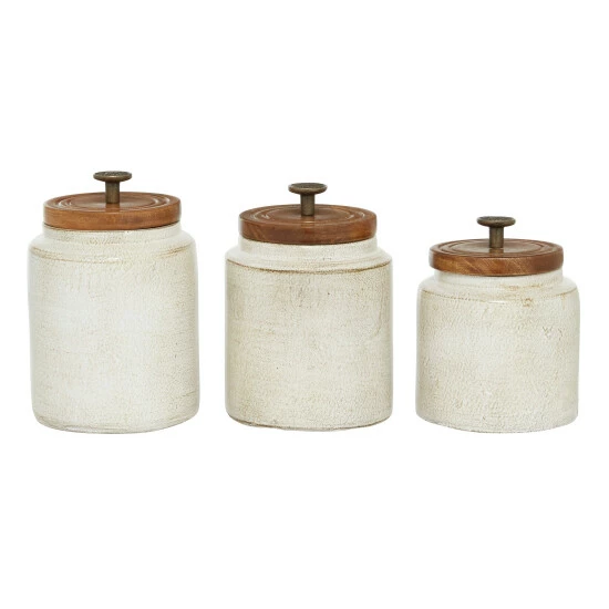 This is a 3-in-1 ceramic canister set for farmhouse kitchens and other tabletops. The cylindrical jars can serve as storage solutions for food ingredients or small trinkets that do not produce moisture or smell when covered. These terracotta jars will make good stand alone decors on kitchen counters or storage for small objects. This item comes shipped in one carton. Please note that this item is for decorative purpose use only and are not food safe. Bodies are smooth and white. Lids open by lifting the iron handles. Suitable for indoor use only. Made in India. Each set comes with 3 decorative jars. Country Cottage vibe.