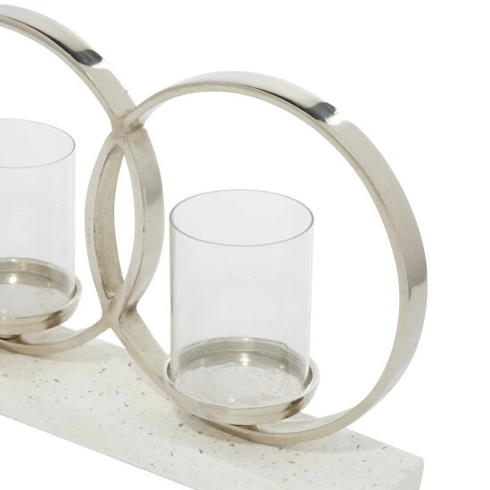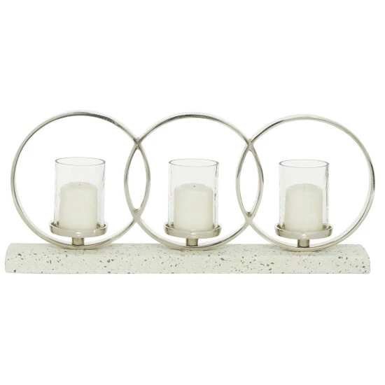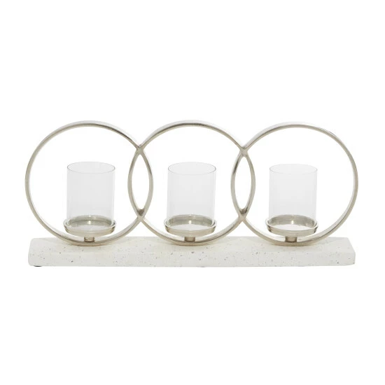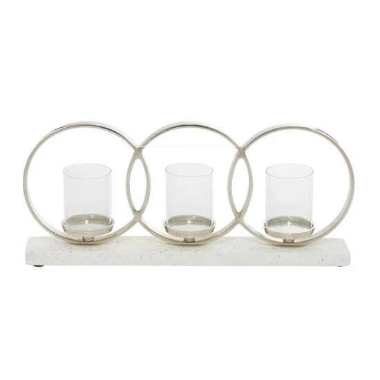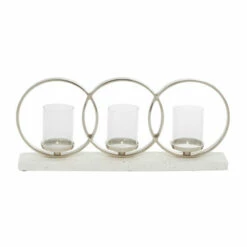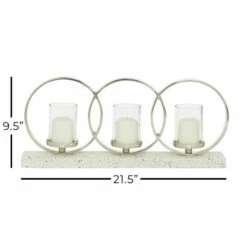 Use this candle holder centerpiece to add beauty and light your mantel or coffee table. Delight your guests and make any occasion extra special by adding a lighted or flameless candle to this candle holder centerpiece. Made with a sturdy base, it is perfect for creating an elegant atmosphere at your table top or mantel. Designed with black rubber stoppers at the base that prevent scratching furniture and table tops, as well as sliding around. This decorative candle holder will hold three pillar candles. This item comes shipped in one carton. Suitable for indoor use. Made in India. Contemporary design.