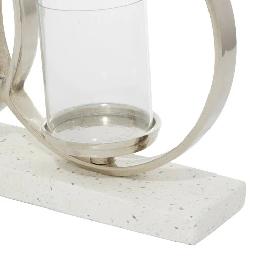 - This decorative candle holder is crafted from terrazzo, glass, and aluminum
