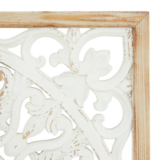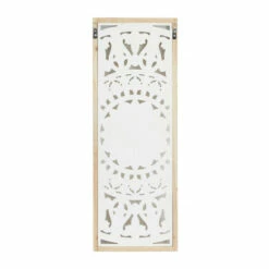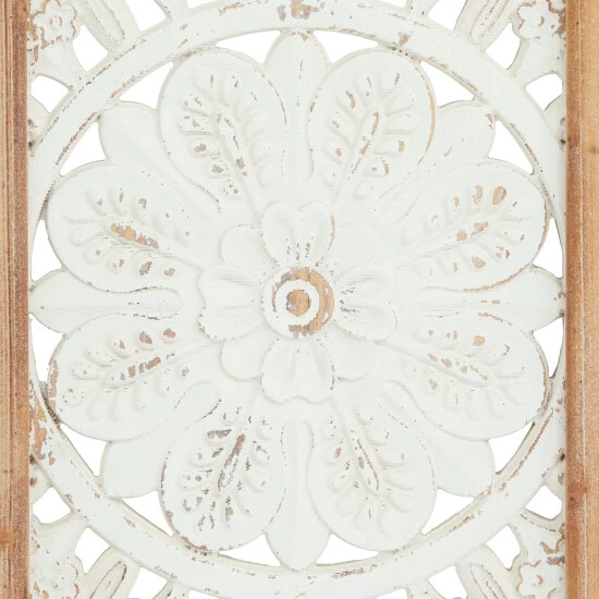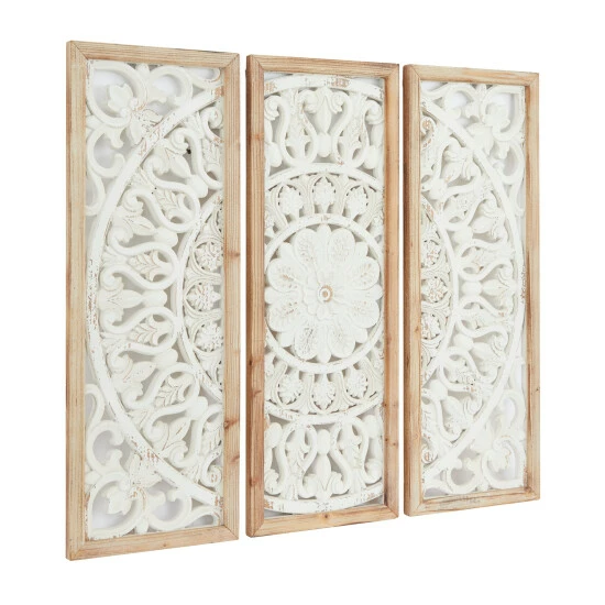 - This wooden wall decor set features 3 rectangular panels with floral patterns and decorative flourishes