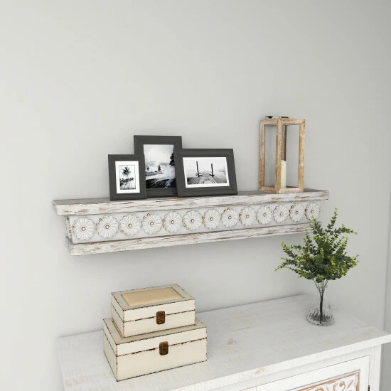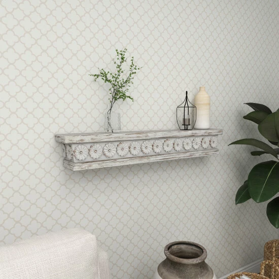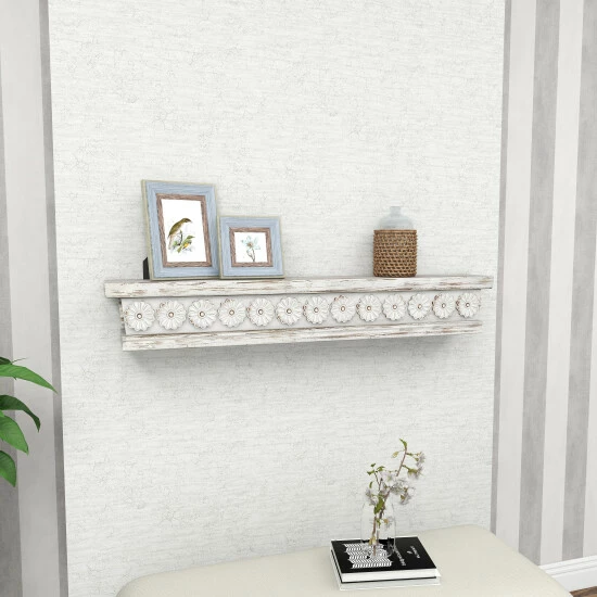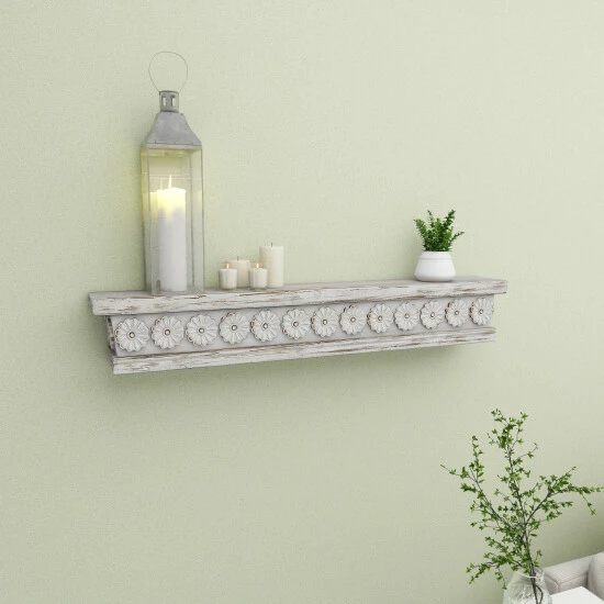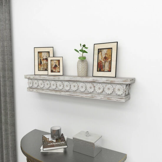 - This remarkable small wooden wall shelf showcases an aged wood exterior look and a floral-carved design