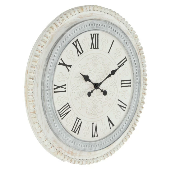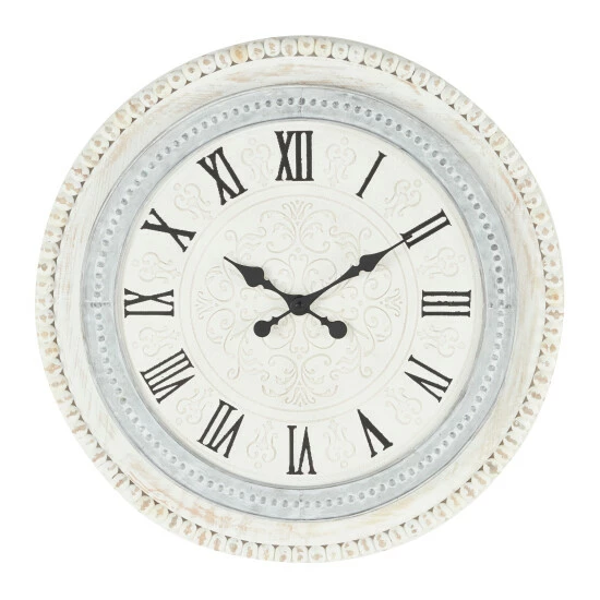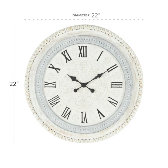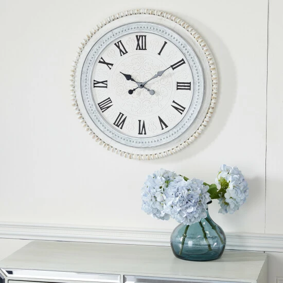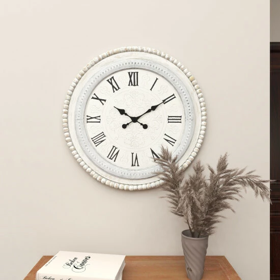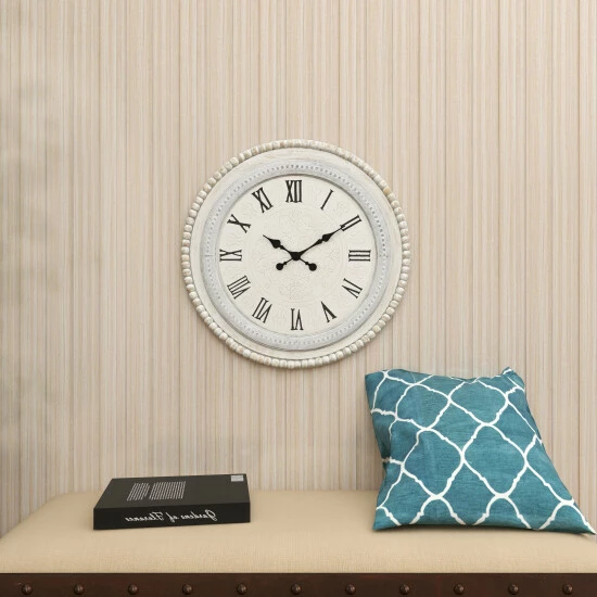 Clocks need not always be plain. This antique farmhouse-themed wall clock doubles as a hanging decoration with its beaded frame and intricate details. It’s made from two types of wood, Chinese fir and Chinese red pine, which were painted with white and given a distressed look to achieve a down-to-earth feel. This wooden wall clock runs on one AA battery that is not included in the package and hangs via a metal backing.
