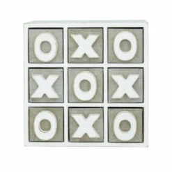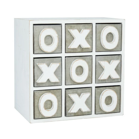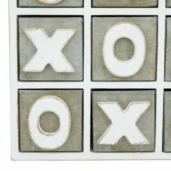 - A decor piece featuring a white tic tac toe cabinet with chipping details and a square structure consisting of 9 long gray blocks with embossed “X” and “O” accents
