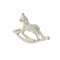 Take your home decoration to the next level with this wooden rocking horse sculpture. This figurine is bound to impress your guests with the stunning design and the optimistic atmosphere it provides. Made of mango wood, this accent piece features a stylized rocking horse figure with intricate detailing and distressed white finish. This incredible accent decor piece will definitely enhance your home with a perfect mix of form and function. Place this sculpture in the lobby, living room, or bedroom to provide a vintage or farmhouse style to your space. Display on top of a bold-colored surface with a distressed wood finish so the whitewashed exterior pops. Wipe clean with a dry cloth. Suitable for indoor use only. Made in India. Vintage inspired. This item comes shipped in one carton.