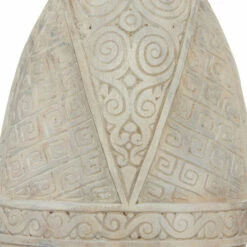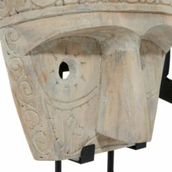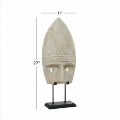 Handmade in Indonesia, this stunning tribal mask is hand-carved from natural albizia wood with intricate eclectic designs. The decorative mask is displayed on a black metal stand secured with 2 metal posts to elevate it. The entire wood sculpture maintains its natural eggshell white and cool white hues and features intricate, hand-carved round and square spirals and tribal patterns around the circular holes cut out for the eyes. The side profile emits realistic dimension with a slight angle from the ceremonial headdress-shaped upper descending into carved brow and nose. This item is shipped in one carton. Suitable for indoor use only. Handcrafted in Indonesia. Vintage inspired. Due to the handmade nature of this item, no two will be alike, there will be slight differences in shape, size, and color.