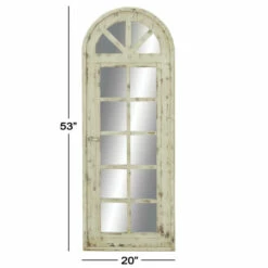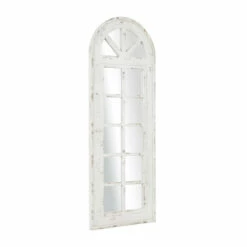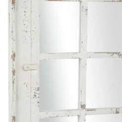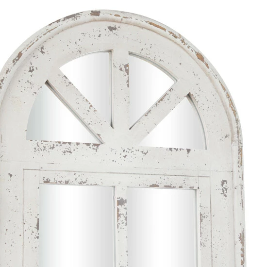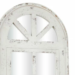 The distressed finish on the white wooden frame pays tribute to the doors and windows of the past. Decorating ideas include hanging on a solid-colored wall, placing a potted indoor plant at the bottom or on one side, and situating a wooden dresser with the same color scheme beside it. This accent wall decor and mirror for vintage and rustic themed interiors. This item hangs via D-ring hardware. Suitable for indoor use only. This item comes shipped in one carton.