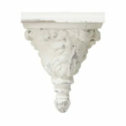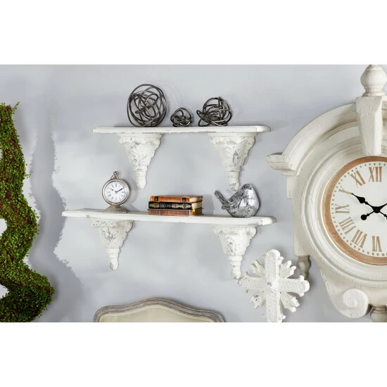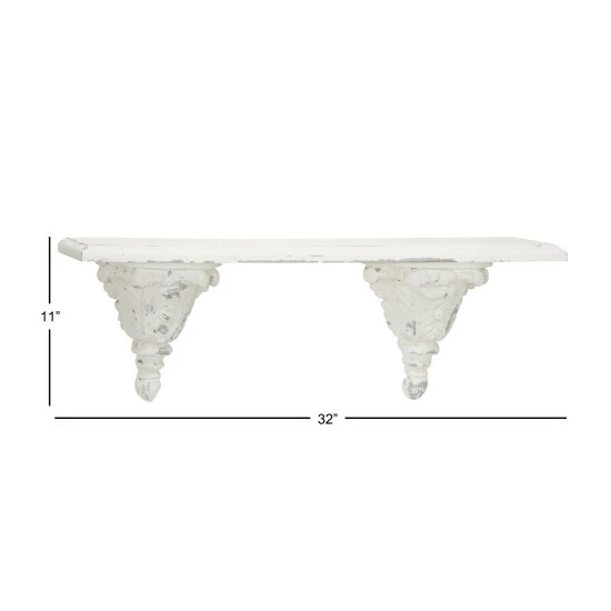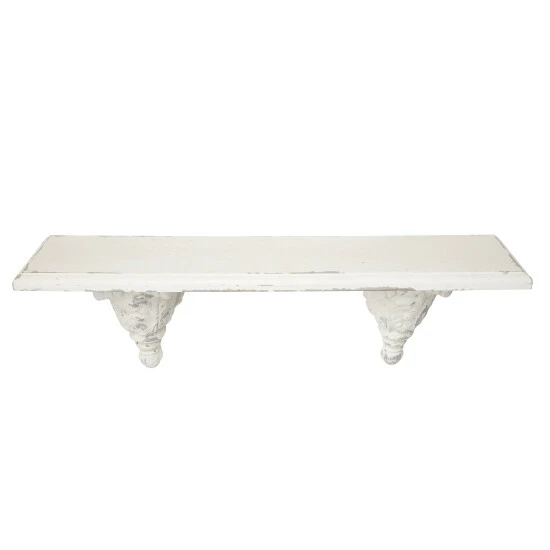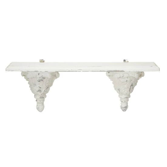 Display your coveted wares with soft vintage style on this white floating wall shelf, boasting decorative carvings along its edges. The long, flat rectangular shelf surface securely displays your photos and Knick knacks while the acanthus-carved base adds antique flair and dimension to your wall. The bright white hue works with any color palette, and the decorative chipped finish revealing a soft gray tone adds extra character. This item comes shipped in one carton. Easy to hang by keyhole hardware. Suitable for indoor use only. Holds up to 20 lbs. Vintage inspired.
