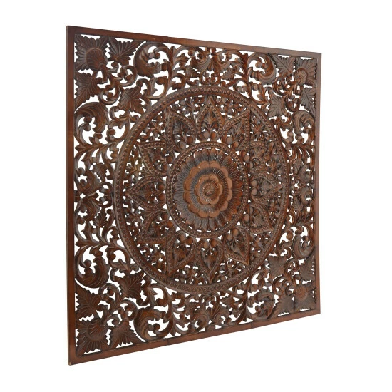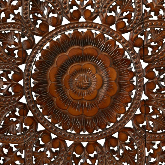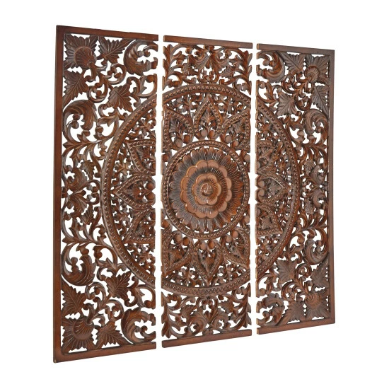 - This large wood panel wall decor showcases 3 rectangular flourish panels designed with intricately carved scrolls, leaves, and a central flower medallion