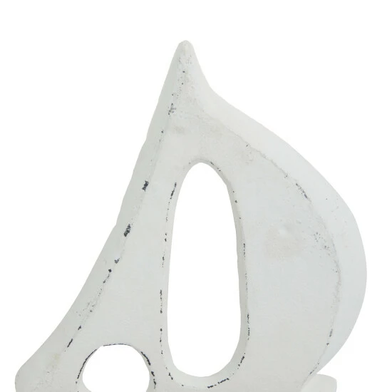- These abstract-style boat figures feature a distressed white metal finish and a textured brown wooden finish