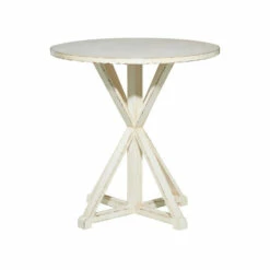 The round table with an hourglass-shaped base is constructed of solid wood that will stand the test of time