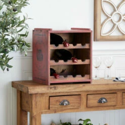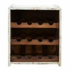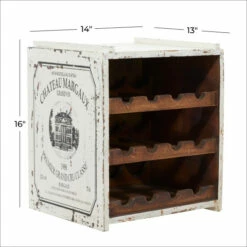 This distressed white/red 12-bottle stackable wooden wine rack cabinet gives your farmhouse-themed home a warm and cozy vibe. This stackable wine holder is made with wood, it highlights a 3-tier rack for holding 4 bottles in each layer. This wooden wine cabinet also flaunts a distressed white/red and brown exterior finish and a natural wood brown interior finish. Placed on your indoor or outdoor tables, this stackable wine rack cabinet is a rustic addition to your farmhouse home spaces. This item comes shipped in one carton. Suitable for indoor use only. This item can hold 12 wine bottles. Showcases a French vintage-inspired mansion imagery and typographies of “Chateaux Margaux Grand Vin” and “1988 Premier Grand Cru Classe”. Farmhouse-themed style.