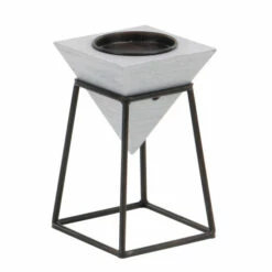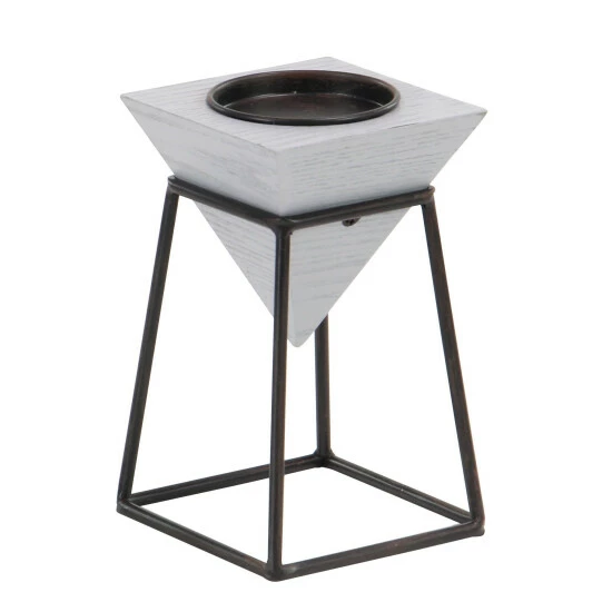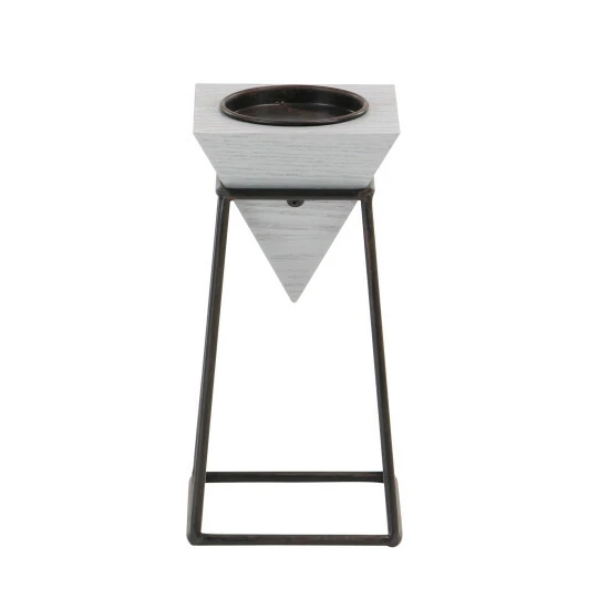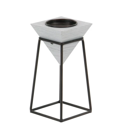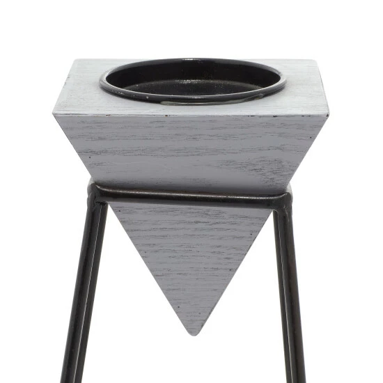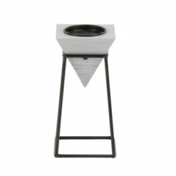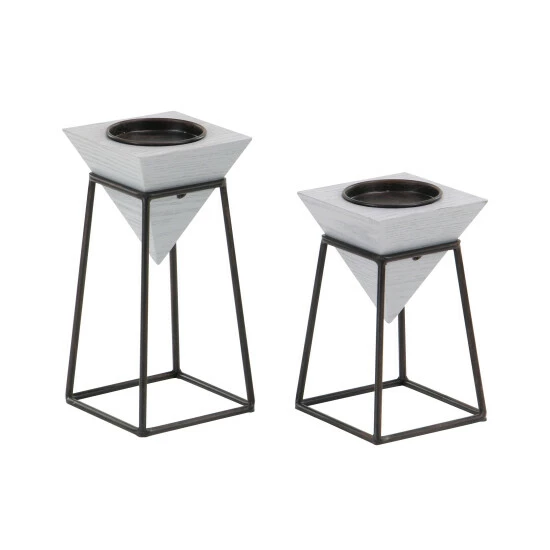 Liven up your space with this pair of chic, modern geometric, white/grey wood candle holders in metal platform frames. The bold pyramid silhouettes of the carved wood with exposed grain will work well with your other trendy geometric decor while elevating your candles for prominent display. Secure your favorite colored pillar candles in place with each 3″ metal plate and switch them out depending on your mood or whatever spells you’re casting. No matter what colors you choose, the neutral and versatile white/grey tones will agree. Designed with black rubber stoppers at the base that prevent scratching furniture and table tops, as well as sliding around. Each candle holder can accommodate 1 pillar candle. This item comes shipped in 1 carton. Suitable for indoor use only. This set includes 2 candle holder. Modern Design.
