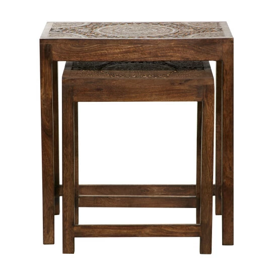 Display this eclectic style nesting table set together or separately in your entryway, living room, bedroom, or kitchen. Use it as an accent piece in the living room, library, bedroom, waiting areas, or hallways of you home. A compact friendly table providing you with additional storage space any where in your home. This item comes shipped in one carton. Nesting tables can be used together or separate. Suitable for indoor use only. Each accent table can support up to 100 lbs. Made in India. These wood carved tables come as a set of 2—one large and one small. Eclectic design