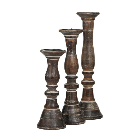 A warm and welcoming way to elevate the look of your tablespace and complement your existing decor. Give your surface space a finishing touch with these beautifully crafted candle holders. Provide necessary amount of light in your place without needing to light up the entire room with this set of 3 distressed brown, light brown, grey, or black candle holders that bring a remarkable look to your table top. Traditional candle holders that accommodate pillar candles. This item ships in 1 carton. Suitable for indoor use only. Made in India. A set that comes with 3 wooden candle holders. Traditional Setting.